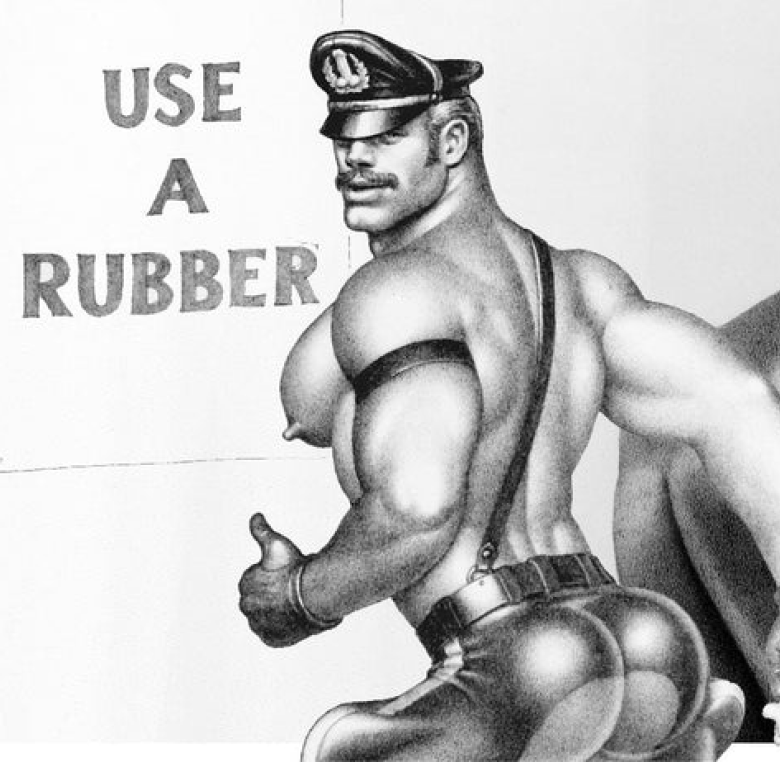 During the 1980s, at the height of the AIDS crisis, Tom of Finland (Touko Laaksonen, Finnish, 1920-1991) began including condoms in his drawings to help curb the epidemic.
