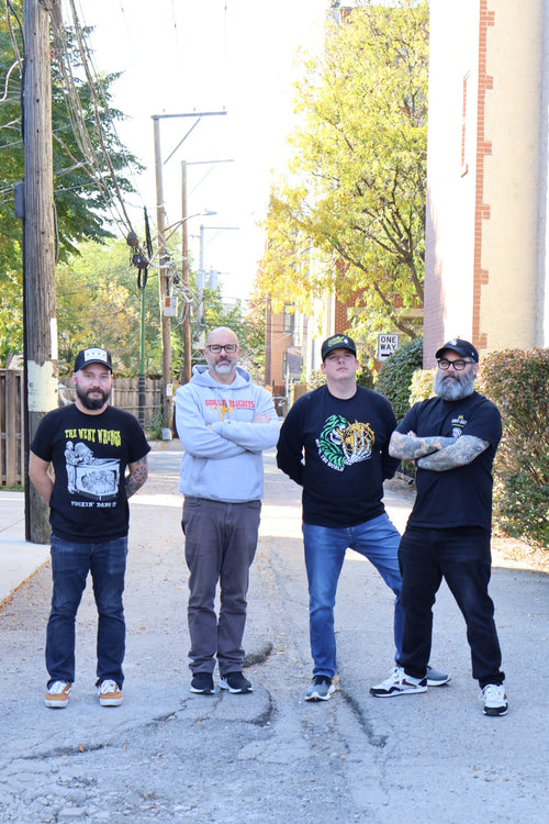 Four men standing in a forest, wearing black t-shirts with visible text and graphics.